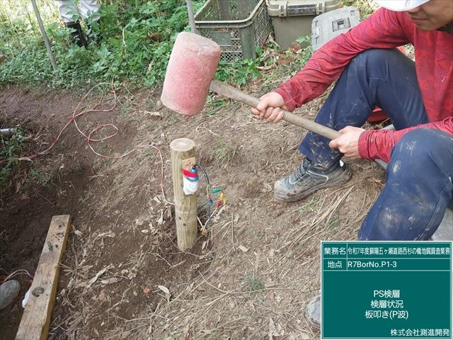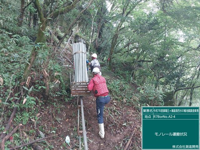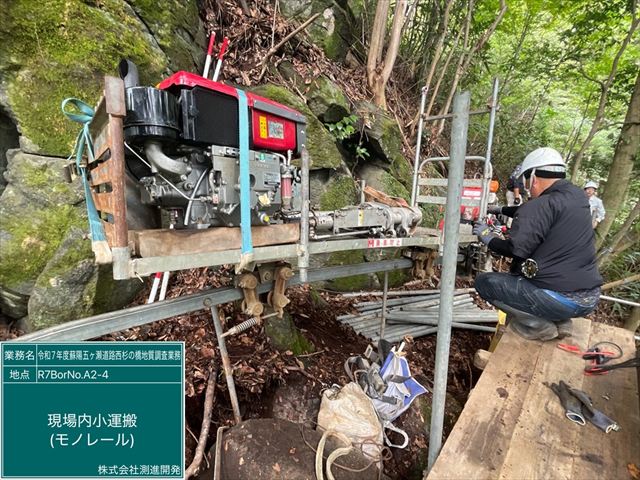 本業務は蘇陽五ヶ瀬道路において、宮崎県西臼杵郡五ヶ瀬町で計画されている西杉の谷橋の橋梁設計等に必要な地質調査を行うことを目的とした。 業務では、計画橋梁の橋台・橋脚箇所において、モノレール架設・搬入、9箇所(延べ141m)の調査ボーリング、 各種原位置試験(標準貫入試験、孔内水平載荷試験、PS検層)、室内岩石試験及び地質解析を実施したものである。 調査の結果、表層部を除くと、A1橋台及びP1橋脚部は中生代~古生代の秩父帯である緑色岩、 A2橋台及び補強土部では阿蘇溶結凝灰岩(阿蘇4、阿蘇3)が確認された。 構造物の支持層としては、A1橋台及びP1橋脚部ではN値50以上を示す緑色岩、 A2橋台及び補強土壁部ではN値50以上を示す阿蘇3溶結凝灰岩である。 基礎形式としては支持層までの深さを考慮すると、A1橋台部は直接基礎、P1橋脚及びA2橋台部は杭基礎の採用が考えられる。 また、A1橋台及びA2橋台部は山地部の傾斜地形であり、 支持層の出現標高が10°以上傾斜した「斜面上の基礎」となることから段差フーチングの採用が望まれる。